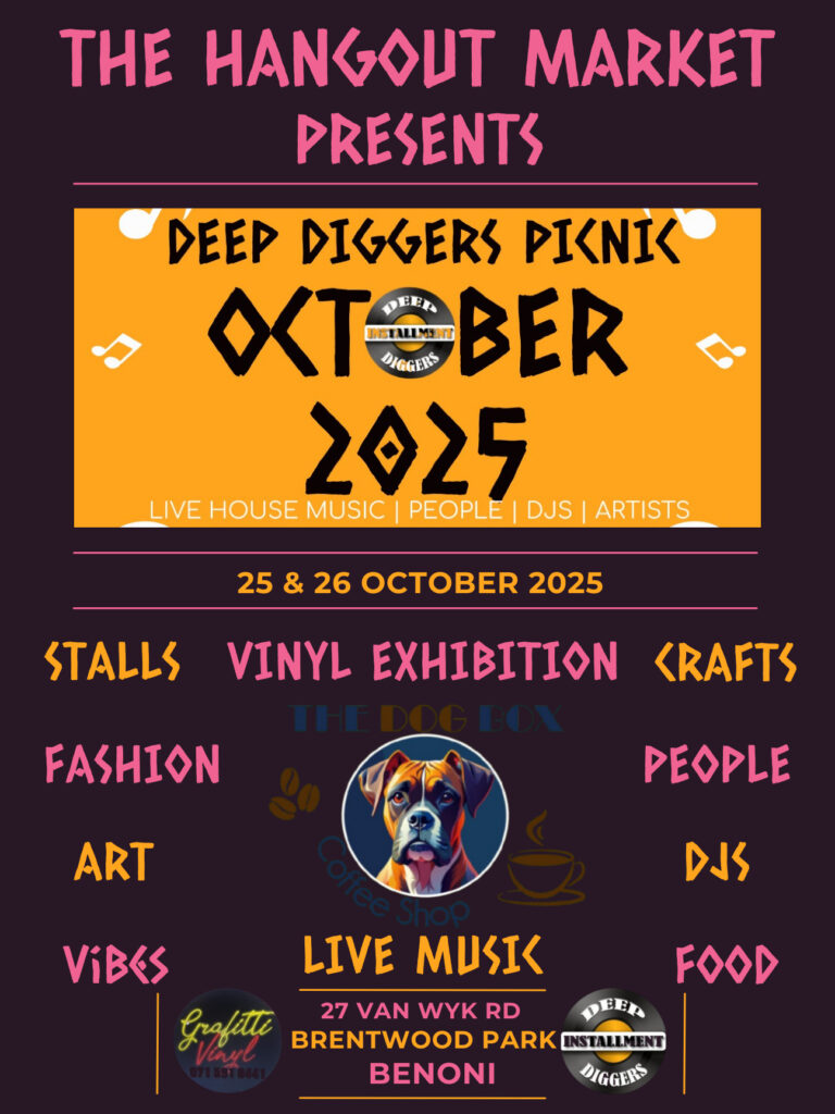 Hello Joburg..The Hangout Market Presents DEEP DIGGERS PICNIC @ The Dog Box Coffee Shop..25 & 26 October 2025..11AM – 9PM..27 Van Wyk Rd..Brentwoodpark AH..Benoni..www.thehangoutmarket.co.zaStalls:https://thehangoutmarket.co.za/book-stall/Contact Lulama:063 118 5207..lulama@thehangoutmarket.co.zawww.thehangoutmarket.co.za
